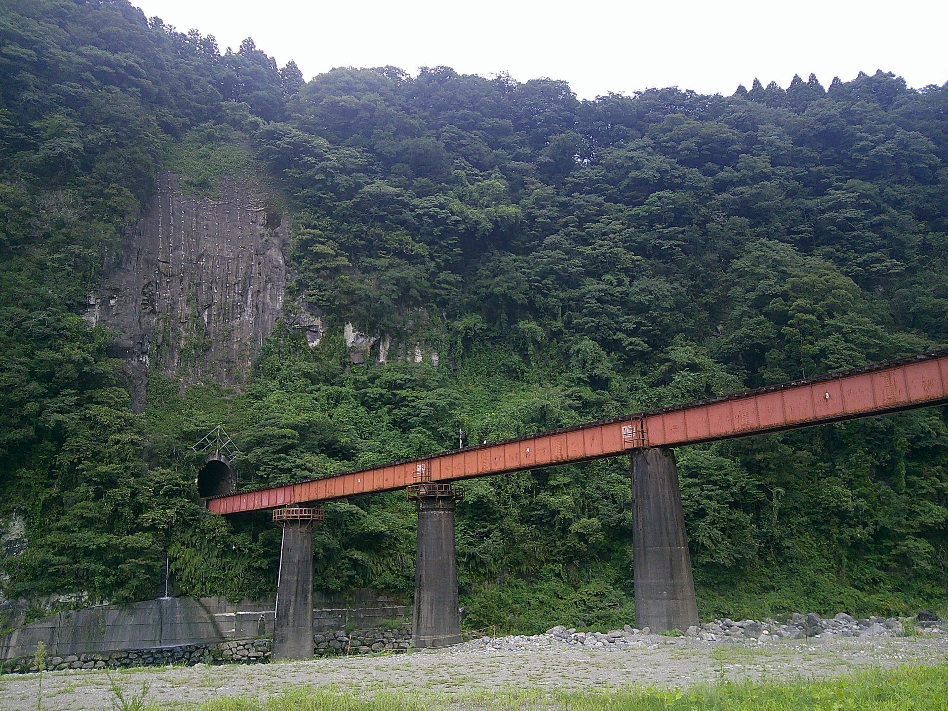 豊肥本線はその岩壁に掘られたトンネルを通り川の上を渡ります。