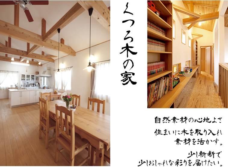 住む人の心を、深いやすらぎと快さでつつむ自然が生み出した素材(木)。 この素晴らしい 『木の可能性や、木のもつ豊かさ、美しさ』 を生かした住まいづくりは、家族のライフスタイルを快適で心豊かな暮らしに変えます。